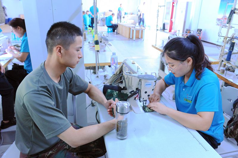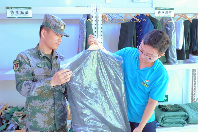 际华集团保障服务队进驻兵站时,正值酷暑,也正是战士们训练最紧张的时期。战士们经常顾不上洗衣服就直接拿来修理,虽然衣服带着浓重的汗味儿,但我们的服务人员没有一点点不适应,他们拿过来就干,看到衣服磨出的破洞、踩烂的脚口以及战士们自己笨拙的手缝的针脚和颜色不一的缝线,更多的怜惜和疼爱油然而生。服务人员中的老大姐陈永红、王国英说:“这些战士都和我们的孩子差不多大,孩子们太辛苦了,不容易啊!”每每听到战士们对她们说谢谢,她们在感到无比满足的同时会更加疼惜这些孩子。