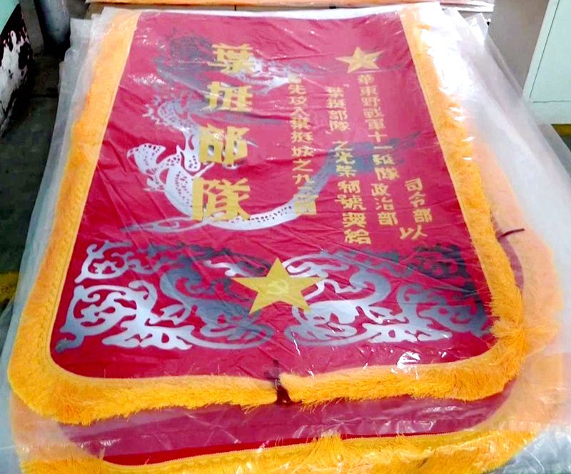 际华3543公司是军队服饰专业供应商,在新产品的研发试制及生产中有着得天独厚的优势,然而本次阅兵战旗生产也经受到严峻考验。6月14日,公司接到军方战旗生产任务,由于时间紧,基础技术资料不完善,需要边实验边完善,给战旗生产带来了严峻挑战。为了保障任务圆满完成,公司立即成立专项组,安排进行技术攻关,运用图片资料分析补充技术信息,研究攻克复制战旗技术难题,仅用不到两周时间就生产出第一套战旗样品。7月9日,样旗经历了第一次现场试验,为了战旗更庄严,公司技术人员结合使用要求对战旗图稿又进行较大调整,重新进行对比编号,用最短时间完成了第二批训练用旗样旗生产。经过训练试用,公司在军委政治工作部、联合参谋部、后勤保障部的大力支持下,再次到阅兵村联合指挥部进行了训练旗征询意见,进一步完善技术参数,改进制作方案,并针对每面旗帜制定了工艺,形成了单旗、夹旗、复合旗等多种印制方式,增加了发泡印刷、刺绣贴补绣等方案,结合生产的难点,针对性制定了解决措施。截止8月31日,经过三次重大改进,三批训练旗及正式阅兵战旗终于全部按照时间节点交付。