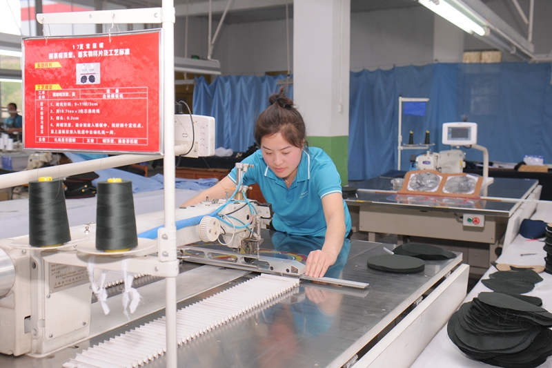绱帽檐、帽条等部位因材料坚硬容易磨烂手指,工人用纱布简单包扎后坚持工作