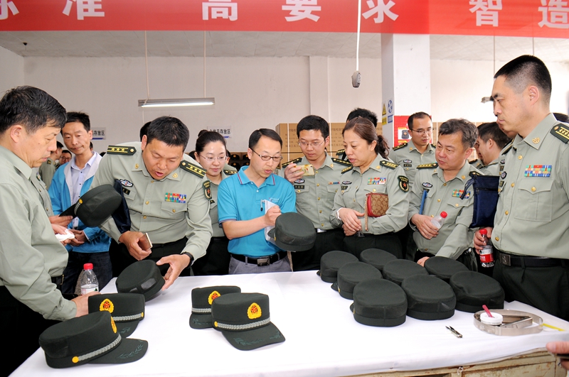 中央军委后勤保障部军需能源局被装处处长侯晓明、军需装备研究所所长黄汉斌等军队领导和际华集团总经理韩文虎在际华3534公司检查夏常服帽生产模板设计制作