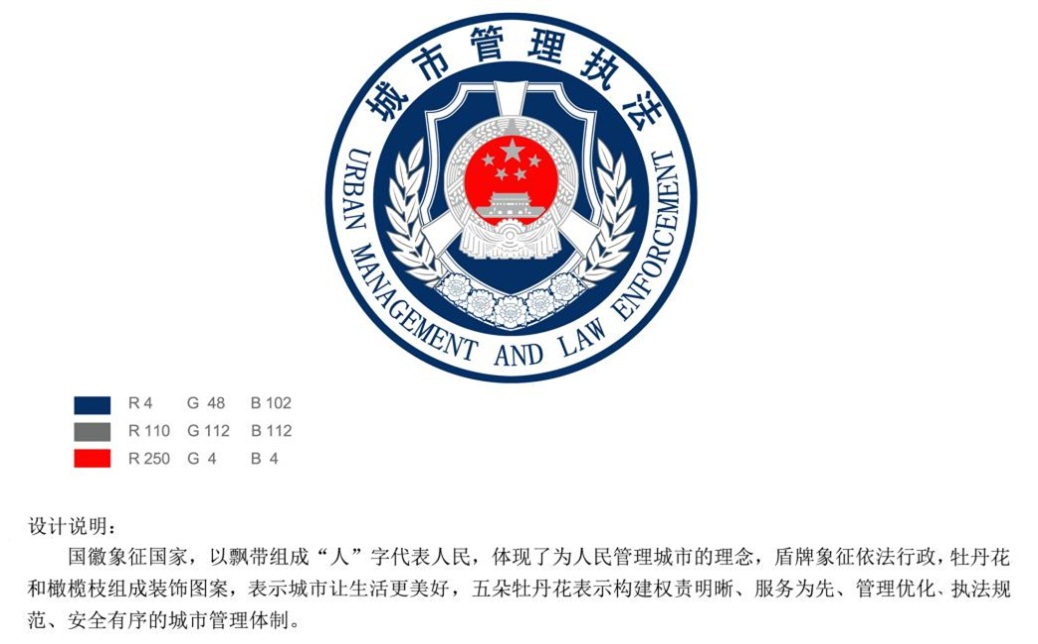 在充分理解“为人民管理城市”理念的基础上,际华集团设计人员结合自身丰富的经验,在标志标识设计过程中大胆创新,突出以人为本、服务为先的价值导向,采用国徽、人字飘带、盾牌、牡丹花、橄榄枝等元素,国徽象征国家,以飘带组成“人”字代表人民,体现了为人民管理城市的理念;盾牌象征依法行政,牡丹花和橄榄枝组成装饰图案,表示城市让生活更美好;五朵牡丹花表示构建权责明晰、服务为先、管理优化、执法规范、安全有序的城市管理体制,行业特点十分鲜明,获得了住建部领导的一致认可。