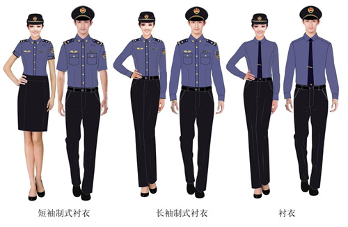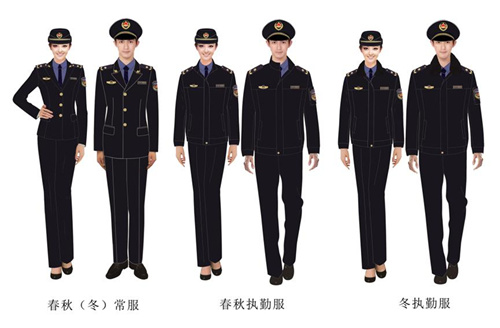 统一的城市管理执法制式服装颜色为藏青色及天空蓝色,搭配金黄色为主色调的标志。服装功能则主要考虑适应城市管理执法工作场所多在户外、街头的实际,便于执勤活动。分为春秋(冬)常服、春秋执勤服、冬执勤服、短袖制式衬衣、长袖制式衬衣和衬衣。经过三易其稿,设计团队按照住建部要求不断精益求精,最终完成设计终稿。