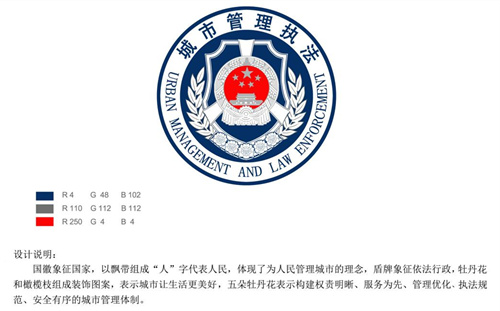 城市管理执法制式服装和标志标识的设计,突出了以人为本、服务为先的价值导向,行业特点鲜明。采用国徽、人字飘带、盾牌、牡丹花、橄榄枝等元素,国徽象征国家,以飘带组成“人”字代表人民,体现了为人民管理城市的理念,盾牌象征依法行政,牡丹花和橄榄枝组成装饰图案,表示城市让生活更美好,五朵牡丹花表示构建权责明晰、服务为先、管理优化、执法规范、安全有序的城市管理体制,进一步树立了全国城市管理执法人员新形象,展示了际华集团的强大设计实力。