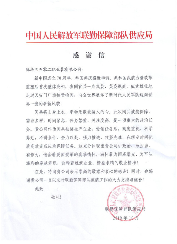 近期,中国人民解放军联勤保障部队供应局发来感谢信,对际华3502公司在新中国成立70周年阅兵被装保障中的突出贡献表示感谢。