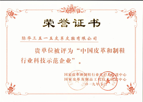 “中国皮革和制鞋行业科技示范企业”是由国家皮革和制鞋行业生产力促进中心、国家皮革及制品工程技术研究中心联合组织评选,代表了中国皮革和制鞋行业科研技术的权威,是中国皮革和制鞋行业科技生产力最高水平的荣誉。