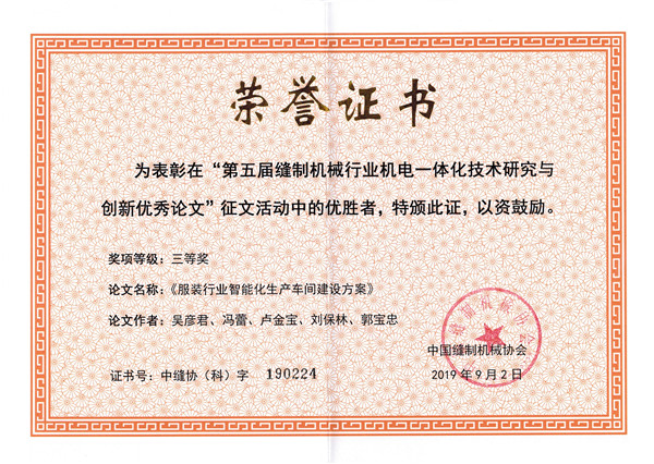为促进行业技术交流,加快先进技术及优秀成果在行业的应用普及、有效推动行业科技发展,中国缝制机械协会联合有关专业机构开展了第五届缝制机械机电一体化技术研究与创新优秀论文评选活动。本次评选活动本着严谨公平、质量第一的原则,共计评选出一等奖三篇、二等奖12篇、三等奖16篇,获奖论文作者单位多为缝制机械设备生产厂商,际华3502公司是唯一一家服装企业。