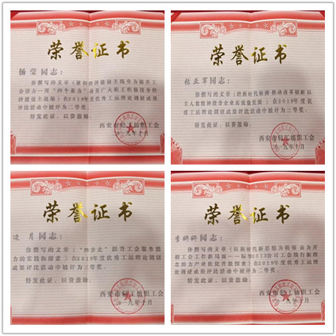 近日,在西安市轻工纺织工会2019年度优秀工运理论调研成果的评比中,公司荣获“优秀组织奖”,并有4篇论文获得表彰。杨莹撰写的《紧扣经济建设主线全力提升工会活力—用“四个着力”动员广大职工积极投身经济建设主战线》、李妍妍撰写的《以新时代新思想为统领 奋力开创工会工作新局面—际华3513公司工会践行新理念助力产业优化升级探索》荣获二等奖,张亚军撰写的《把握时代脉搏 推动改革创新以主人翁精神投身企业高质量发展》、边月撰写的《“四步走”提升工会服务能力的实践和探索》荣获三等奖。