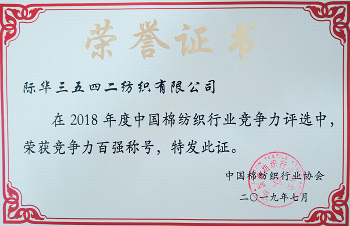 际华3542公司荣获棉纺织行业竞争力百强企业