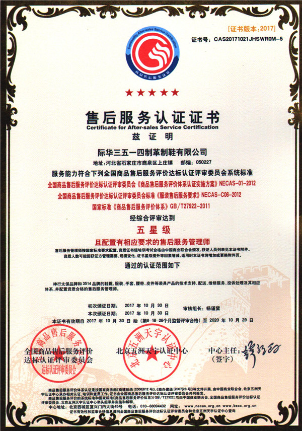 经过近半年的体系运行,10月24-25日,北京五洲天宇认证中心杨谨蜚主任带队来到公司,对产品的技术支持、配送、维修服务、投诉处理等相关服务工作进行了严格、专业的审核。最终,公司以95.16分的综合得分顺利通过现场评审,荣获全国商品售后服务评价达标认证评审委员会和北京五洲天宇认证中心共同签发的《商品售后服务评价体系》最高星级“五星级售后服务认证”证书,成为国内首家通过商品售后服务认证的制鞋企业。