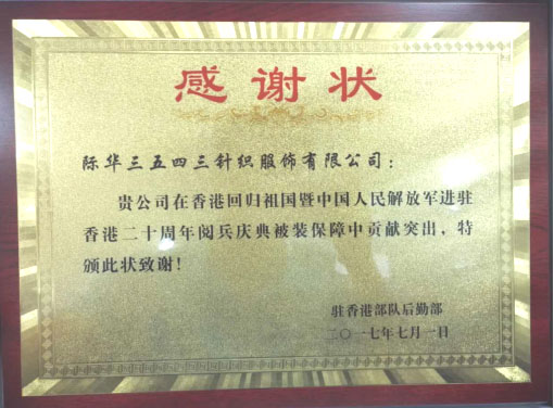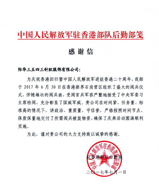 近日,际华3543公司收到中国人民解放军驻港部队后勤部发来感谢状与感谢信,感谢公司在时间紧、任务重、标准难度高的情况下,保质保量按时完成了香港回归20周年庆典装备保障任务。