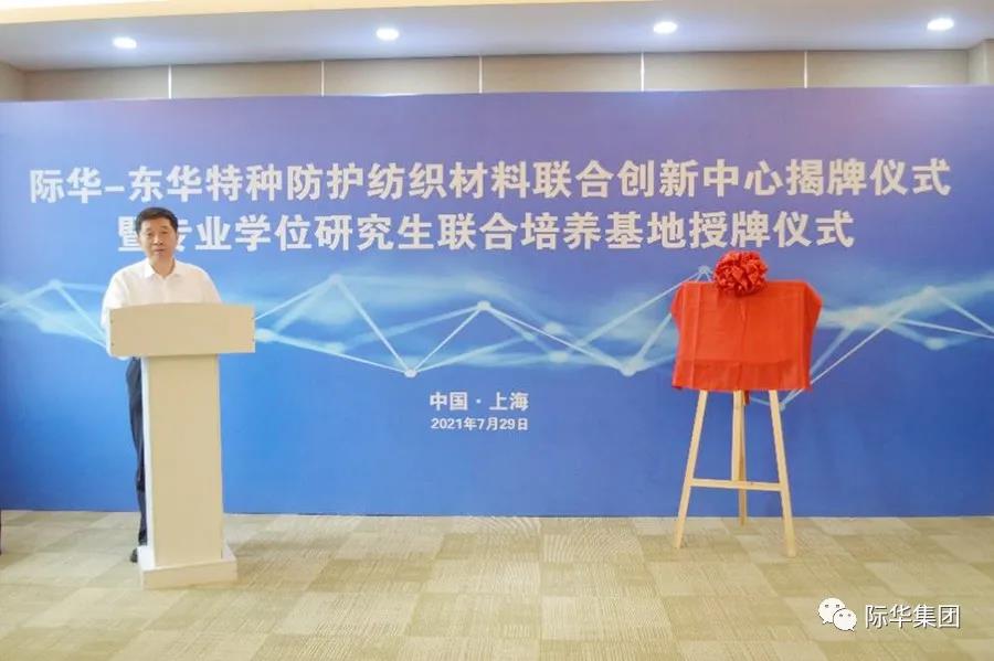 7月29日上午,“际华-东华特种防护纺织材料联合创新中心暨专业学位研究生培养基地”揭牌仪式在东华大学举行,新兴际华集团副总经理徐建华和东华大学校长、中国工程院院士俞建勇分别在揭牌仪式上致辞,际华集团党委副书记、总经理段银海和东华大学科学技术研究院院长丁彬分别代表双方揭牌。