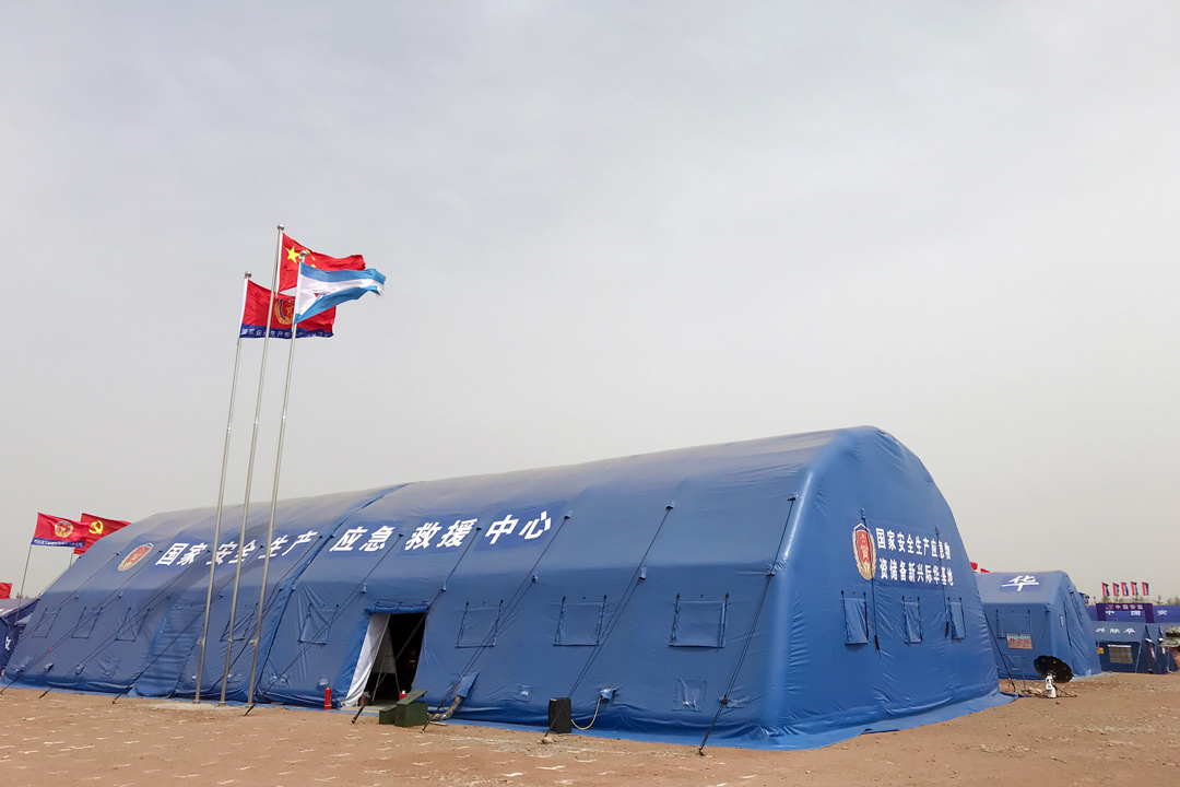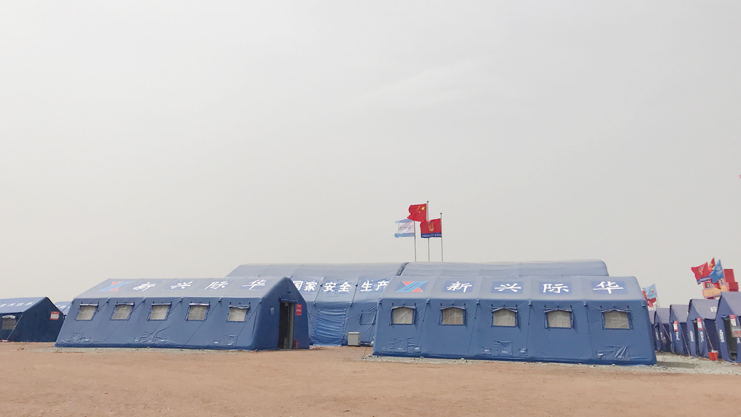 演习中际华股份投入300㎡主指挥充气帐篷1顶、60㎡分指挥充气帐篷2顶,37㎡灾民安置帐篷2顶,12㎡应急住宿帐篷70顶,救灾折叠床200张,72㎡餐饮帐篷2顶,睡袋100个,暖风机10台,折叠桌椅180个,作训大衣、棉被、寒区背囊近1000套件,并保障新兴际华救援队应急抢险服装437套。