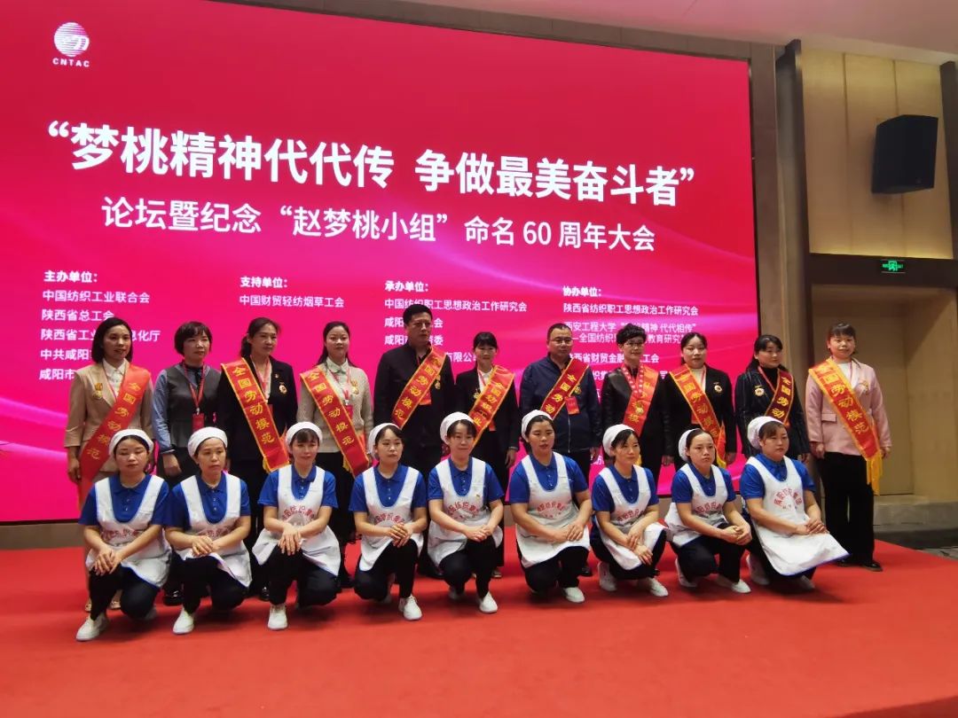 为纪念“赵梦桃小组”命名 60 周年,进一步推动习近平总书记对“赵梦桃小组”亲切勉励贯彻落实,激励全国纺织行业传承弘扬“梦桃精神”,为建设现代化纺织强国再立新功,4月25日,“梦桃精神代代传,争做最美奋斗者”纪念“赵梦桃小组”命名60周年大会在陕西省咸阳市举行。会议由中国纺织工业联合会、陕西省总工会、陕西省工业和信息化厅、中共咸阳市委员会、咸阳市人民政府主办;中国财贸轻纺烟草工会支持;中国纺织职工思想政治工作研究会、咸阳市总工会、咸阳市国资委、咸阳纺织集团有限公司承办;陕西省纺织职工思想政治工作研究会 、西安工程大学“梦桃精神 代代相传”——全国纺织思想政治教育基地、陕西省财贸金融轻工工会、西安纺织集团有限责任公司、际华三五一三实业有限公司、陕西雅兰纺织集团有限公司协办。